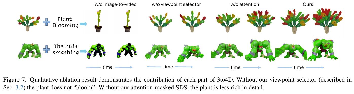 この画像は、3to4D技術のアブレーション研究の結果を示しています。「Plant Blooming」と「The Hulk Smashing」の2つの異なる例があります。左から右に順に、いくつかの要素が欠如した状態での出力を比較しています。 1. **w/o image-to-video**: テキストからビデオを生成する機能が無いと、植物は「咲かない」状態を示しています。 2. **w/o viewpoint selector**: 視点選択機能が無い場合では、動きが制限され、立体感が失われています。 3. **w/o attention**: 注意機構なしでは、植物やキャラクターの細部が粗くなります。 4. **Ours**: すべての要素が揃った状態の出力では、動きや細部が最も自然で豊かに表現されています。 これらは、それぞれの技術がアニメーション生成にどれほど貢献しているかを示しています。