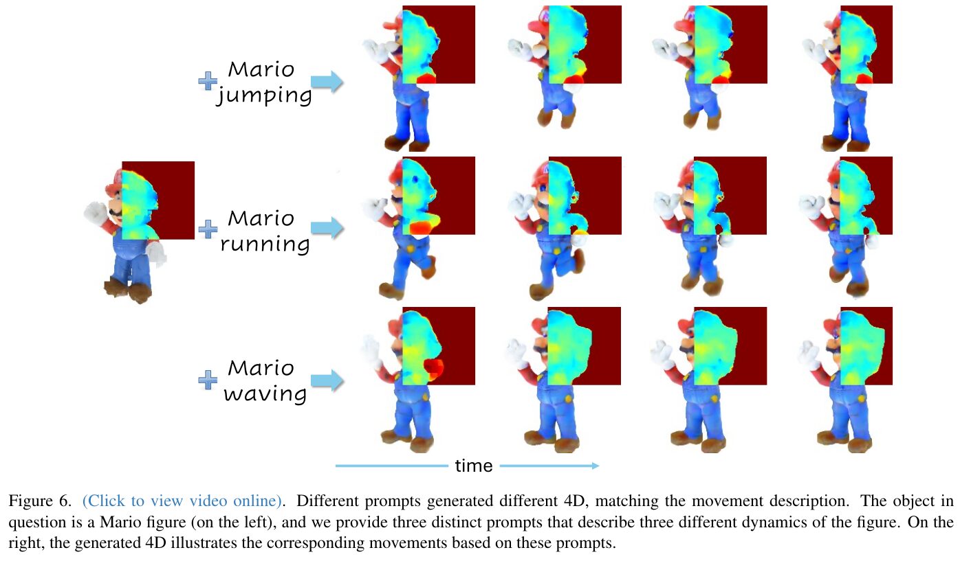 この画像は、「3to4D」という手法を用いて、3Dオブジェクトにテキストプロンプトを基にした動きを追加して4Dアニメーションを生成するプロセスを示しています。例として、マリオのキャラクターが「ジャンプする」、「走る」、「手を振る」という異なる動きをそれぞれ示しています。 左側には静止した3Dマリオの画像があり、これにテキストによる異なる動作指示が加えられています。右側の列は、マリオの動きが時間の経過とともにどのように進化するかを示しています。それぞれの行では、異なる動作が時間の流れに沿って示されており、画像の半分が元の3Dオブジェクト、半分がその動きを示すアニメーションです。これは、「3to4D」手法が3Dオブジェクトにリアルな動きを追加することを可能にすることを示しています。