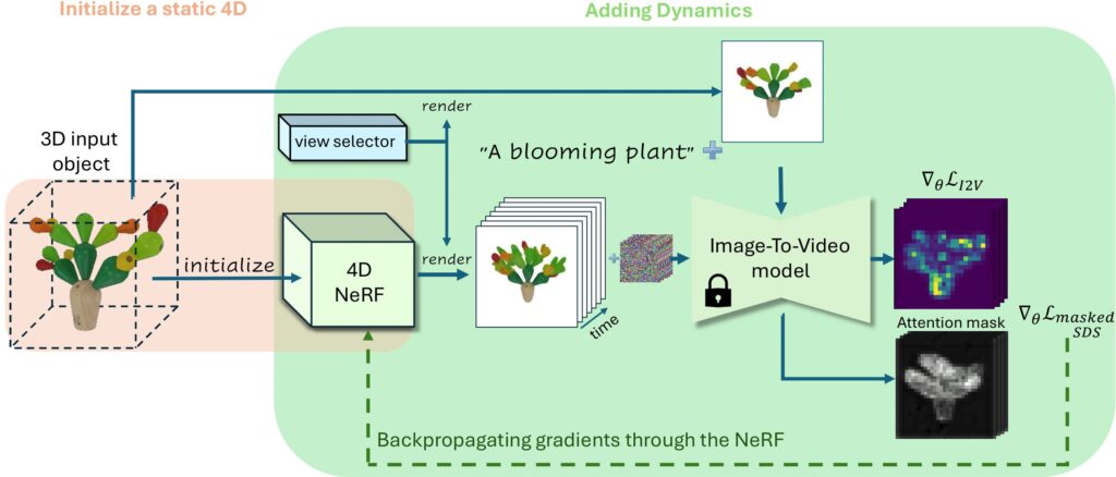 入力された3Dモデルに対しまずは基になる3D形状を理解し、その形状に最適な動的表現を適用します。この際、3Dデータの潜在空間から動きを抽出し、その動きをオブジェクトに付加するための視覚的なフィードバックループを用いて最適化を行います。このプロセスは、画像-ビデオモデルのアプローチを用いて行われ、4Dシーンのリアルタイム生成を可能にします。