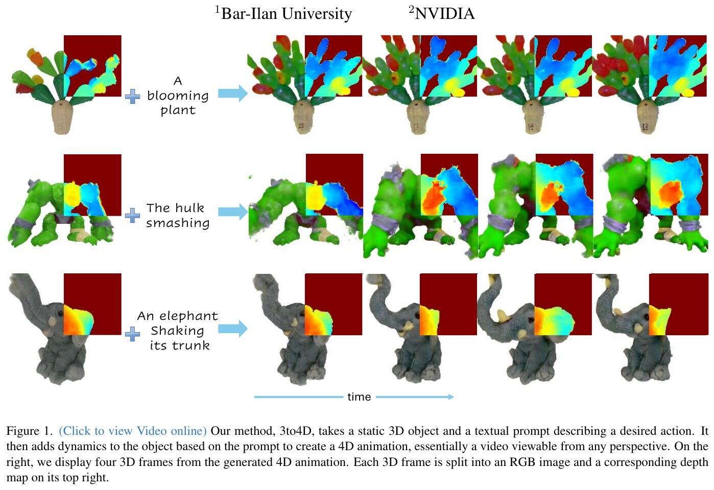 この画像は、静的な3Dオブジェクトを動的な4Dアニメーションに変換する「3to4D」という手法を示しています。具体的には、亀や象、馬、ベルなどのモデルが、テキストで指示されたアクションを実行する様子が描かれています。例えば、「亀が殻の中に頭を隠している」「象が耳を振っている」「馬が尻尾を振っている」などの動きが、連続したフレームで視覚化されています。各フレームはRGB画像と深度マップに分けられており、動きの過程を時間軸に沿って示しています。これは、テキスト指示に基づいて3Dモデルをアニメーション化する研究の一部です。