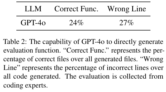 この図は、GPT-4oが評価関数を直接生成する能力を示しています。「Correct Func.」は生成されたコードのうち正しい評価関数の割合を示し、「Wrong Line」は全生成コードの中で間違った行の割合を示しています。GPT-4oは24%の正しい評価関数を生成できる一方で、27%は何らかの誤りを含んでいることを意味します。専門家によるコード評価の結果に基づいています。