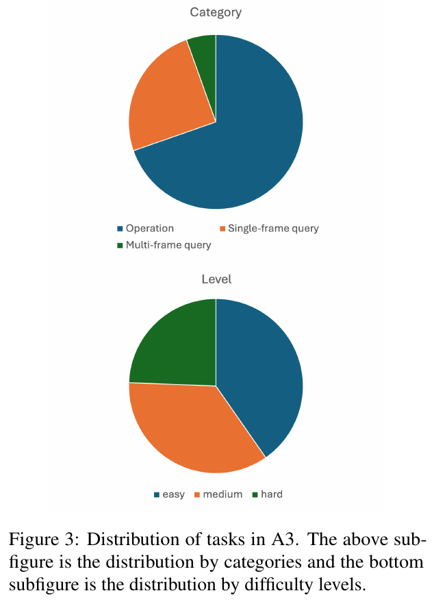 図3は、A3でのタスクの分布を示しています。上の円グラフはタスクを3つのカテゴリー(操作、シングルフレームクエリ、マルチフレームクエリ)に分けた割合を示しており、操作が最も多くの割合を占めています。下の円グラフはタスクを難易度で分けたもので、簡単、中程度、難しいに分かれています。これにより、タスクの種類と難易度の比率を視覚的に理解できます。