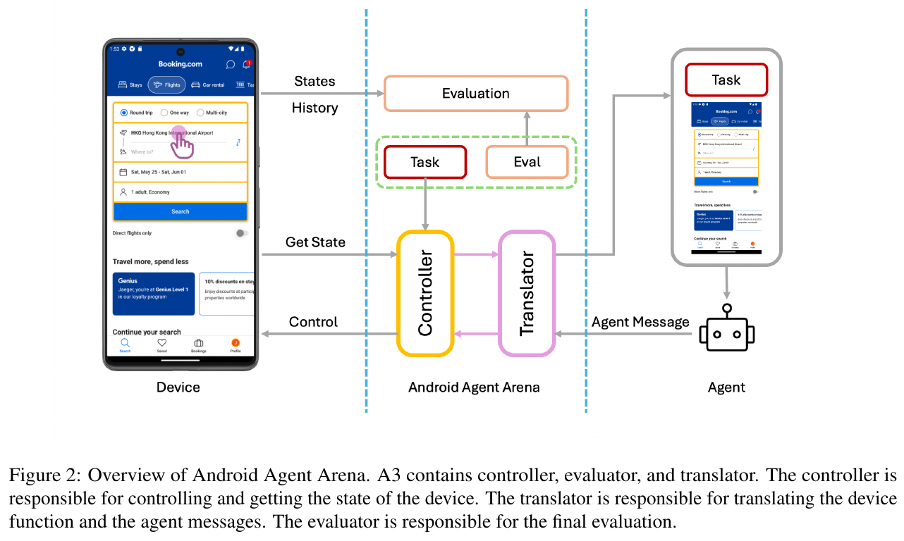 画像は、Android Agent Arena (A3)の概要を示しています。A3は、モバイルデバイス上でタスクを自動的に実行するためのプラットフォームで、コントローラー、トランスレーター、エバリュエーターの3つのコンポーネントで構成されています。コントローラーがデバイスの状態を取得し、トランスレーターがそれをエージェントメッセージに変換します。エバリュエーターは、タスクが正しく完了したかどうかを評価する役割を担っています。このシステムは、リアルワールドのシナリオに基づいて、さまざまなアプリケーションから多様なタスクを評価することが可能です。