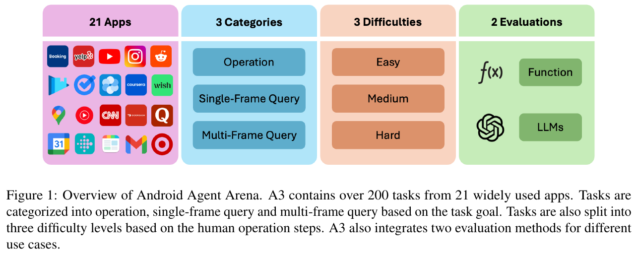 画像は、Android Agent Arena(A3)の概要を示しています。A3は21のよく使われるアプリから200を超えるタスクを含んでおり、それを操作、シングルフレームクエリ、マルチフレームクエリの3つのカテゴリに分類しています。さらに、タスクは難易度別に簡単、中程度、難しいの3段階に分けられています。評価方法は関数評価と大規模言語モデル(LLMs)を用いた2種類があります。これは、異なるユースケースに対応した評価を可能にするためのものです。