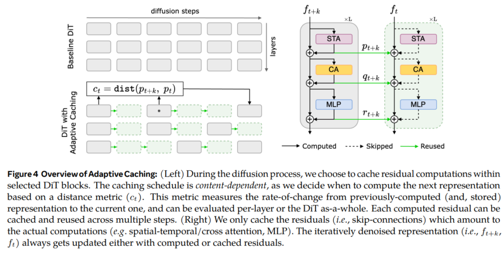 1つ目は「適応的キャッシング」で、動画生成の過程で計算された中間結果を保存し再利用する際、その再利用範囲を動画の複雑さに応じて動的に調整します。