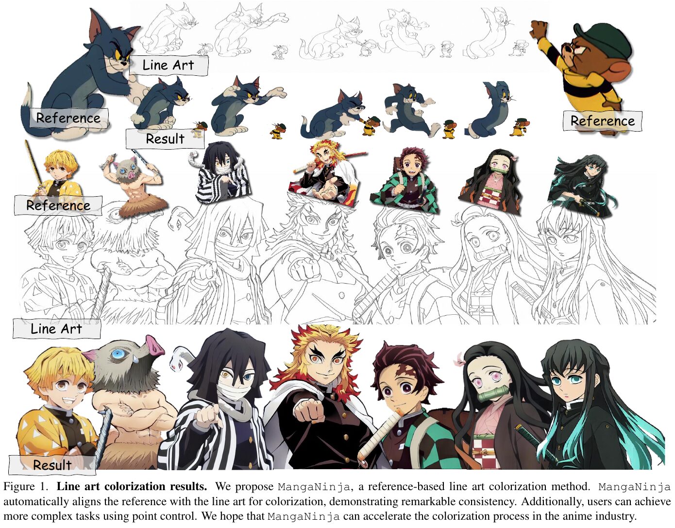 この図は、MangaNinjaという線画の着色技術の例を示しています。左側に参考画像、中央に線画、右側に着色結果が示されています。MangaNinjaは、参考画像に基づいて、線画を着色する技術です。この技術は、ポイントガイドを活用して、ポーズの変化や詳細の欠落といった難しいケースにも対応できると説明されています。例えば、最初の二つの例では、参考画像と線画の違いが大きい中で、着色が正確に行われています。このようにMangaNinjaは、アニメーション業界での色付けプロセスを加速させる実用的なツールとして期待されています。