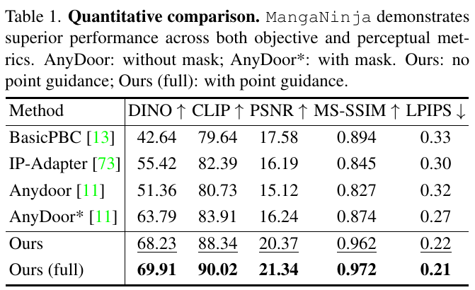 この表は「MangaNinja: Line Art Colorization with Precise Reference Following」という論文からのものです。表は、MangaNinjaが他の手法と比較して色付けの精度と画像の視覚的質において優れた性能を発揮することを示しています。表中の評価指標にはDINO、CLIP、PSNR、MS-SSIM、LPIPSが含まれ、それぞれの指標で高い得点(矢印が上向き)は質の良さを示し、低い得点(矢印が下向き)は誤差が少ないことを表します。 具体的には、MangaNinjaのフルモデル(Ours full)が、特にCLIPやPSNR、MS-SSIMといった指標で最高の結果を示しています。この手法は「ポイントガイダンス」と呼ばれる技術を用いており、それによりより精密な色付けを実現しています。他の手法(BasicPBC, IP-Adapter, AnyDoorなど)と比較した場合、MangaNinjaの方が一貫して良いスコアを記録しています。