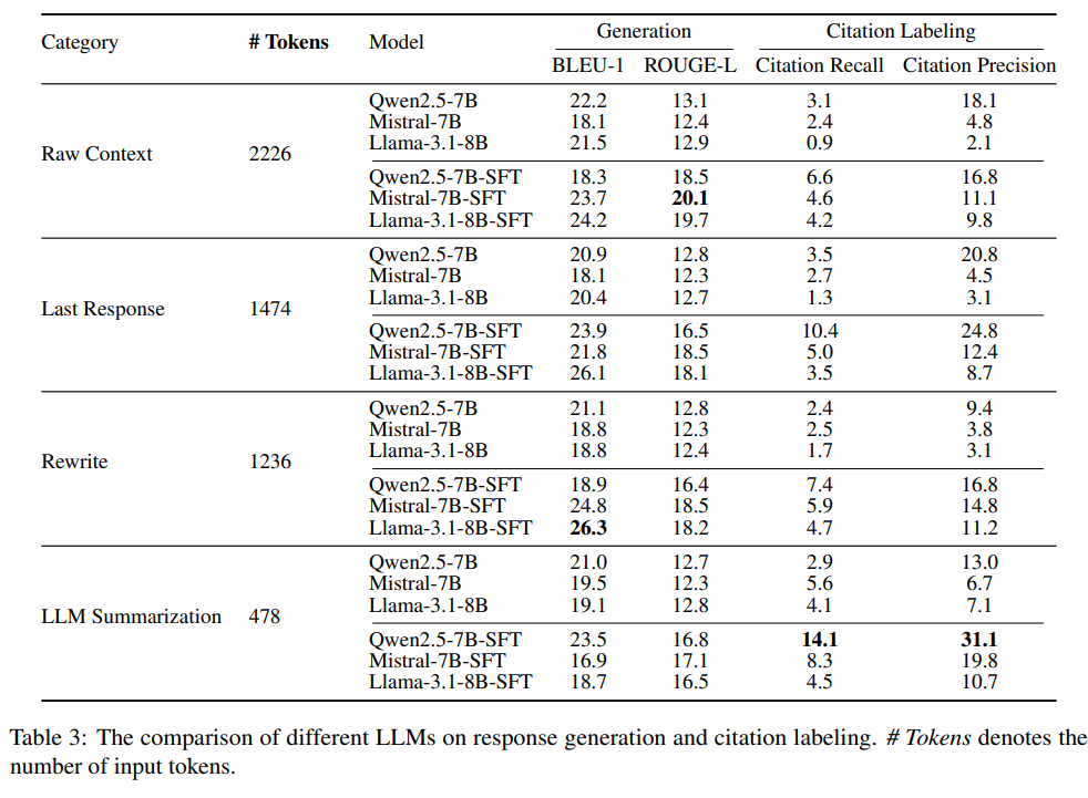 次に、応答生成と引用ラベリングのタスクでは、会話履歴の圧縮方法による影響を調査しました。生の文脈、最後の応答のみ、質問の書き換え、LLMによる要約の4つの方法を比較した結果、入力を短くしても応答の質は維持され、むしろ引用の精度は向上することが分かりました。