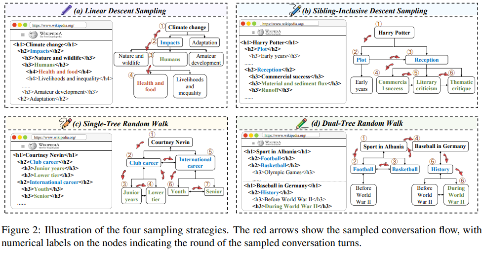 - 解決手法:Wikipediaの階層構造を活用し、4種類のサンプリング戦略で自然な会話の流れを生成。さらにGPT-4を使って文脈を考慮した質問に変換することで、8,000の情報探索型の会話データを自動生成。
