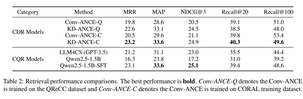 まず、会話型パッセージ検索タスクでは、会話の文脈を考慮した情報検索の性能を測定しました。KD-ANCEやConv-ANCEなどの密な検索モデルと、GPT-3.5やQwen2.5などを用いた質問書き換えモデルを比較したところ、微調整したQwen2.5が最も高い性能を示しました。