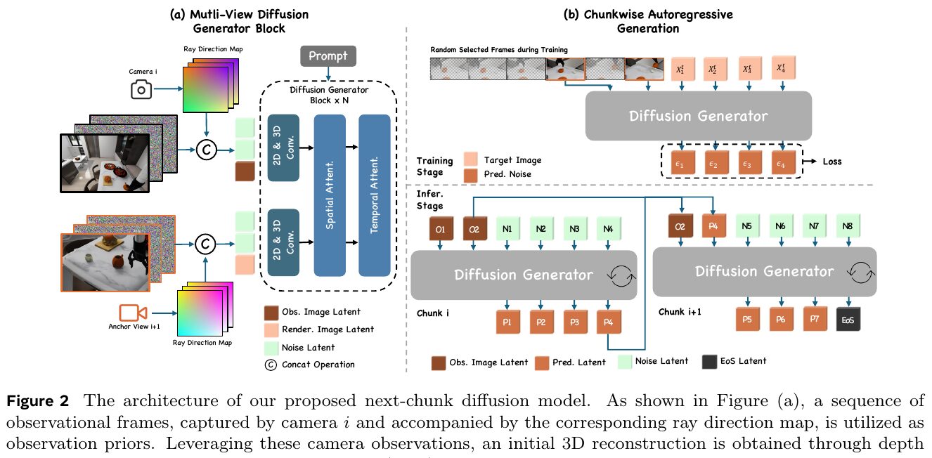 モデル構造は、複数の主要コンポーネントから構成されており、特徴的な技術として、「Chunk Diffusion」や「Free Anchor View(自由視点生成)」が採用されています。特に、Chunk Diffusionは観測データを元に連続性を考慮した未来フレームを生成する機能を持つのに対し、Free Anchor Viewは視点の柔軟性を保証し、カメラの異なる視点でも空間認識を向上させています。この組み合わせにより、従来手法が直面していた予測の不連続性や空間情報の欠落といった課題を効果的に解消しています。