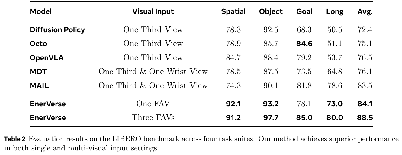実験評価では、ロボット操作シナリオ用のベンチマーク「LIBERO」が使用され、EnerVerseの性能が検証されました。評価基準として、位置精度(Spatial)、視覚認識(Visual)、およびタスク成功率(Task Success)が取り上げられ、提案手法がこれらの指標で従来手法を上回る結果を示しました。また、生成したFAVがより高品質でタスク実行の重要な手がかりとなることが確認されました。