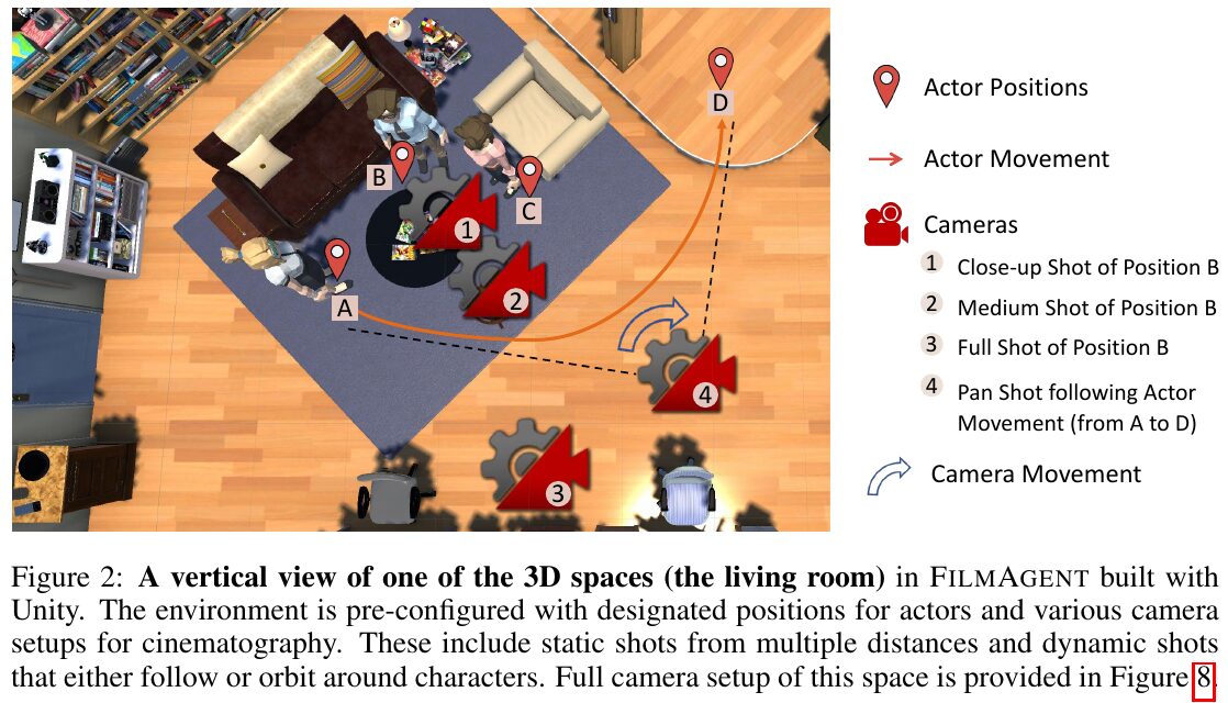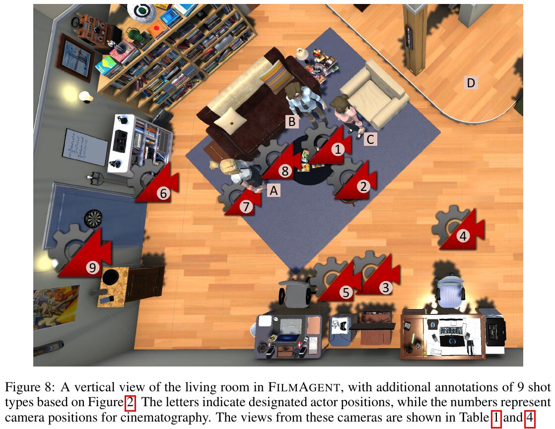 この画像は、FILMAGENTの仮想3Dスペースとして構築されたリビングルームの上からの眺めを示しています。図には、フィギュア2に基づく9種類のショットの注釈が追加されています。アルファベットは指定された俳優の位置を示し、数字は撮影のためのカメラの位置を示しています。これらのカメラからのビューは、表1と4で示されています。この配置は、仮想3D空間における撮影プロセスの自動化をサポートするために設計されています。このシステムは、脚本のアイデア開発からキャラクターの動作、カメラの設定まで、映画制作の全プロセスを追求しています。