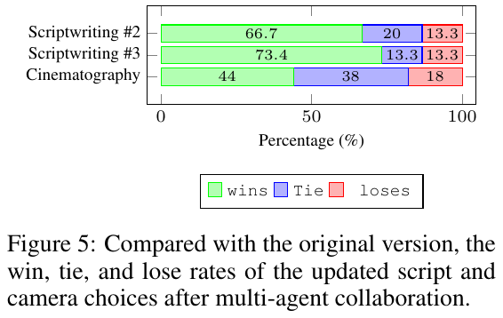 この図は、FILMAGENTというマルチエージェントフレームワークを使った脚本とカメラ設定の改善を示しています。図には、更新前後の勝率、引き分け率、負け率が、スクリプトライティングの第2段階と第3段階、そして撮影段階のカメラ選択に関して示されています。図からは、改良後の勝ち率が高く、脚本とカメラ選択がもとのバージョンより好まれることが示されています。この結果は、エージェント間での反復的なフィードバックと検証によって脚本の質とカメラ選択が改善されることを示唆しています。こうしたプロセスにより、物語の一貫性とカメラ設定の適切さが向上しています。