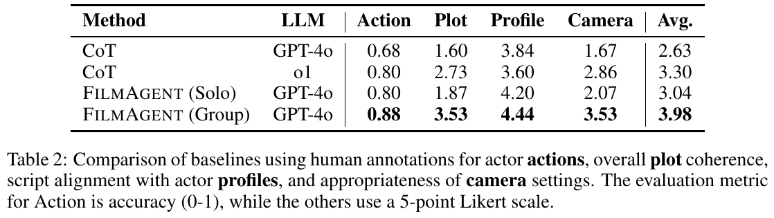 この表は、FILMAGENTフレームワークの評価結果を示しています。さまざまな手法を人間の評価に基づいて比較し、「アクション」の精度、ストーリーの「プロット」一貫性、キャラクタープロフィールとの「プロフィール」一致性、カメラ設定の適切性を評価しています。「アクション」は0から1の精度で評価され、他の項目は5段階リッカート尺度で評価されます。FILMAGENT(グループ)は、すべての基準で最高の評価を受けており、平均3.98点を獲得しています。これは、複数のエージェントの協力が、単一のエージェントよりも優れた映画制作の結果をもたらすことを示しています。