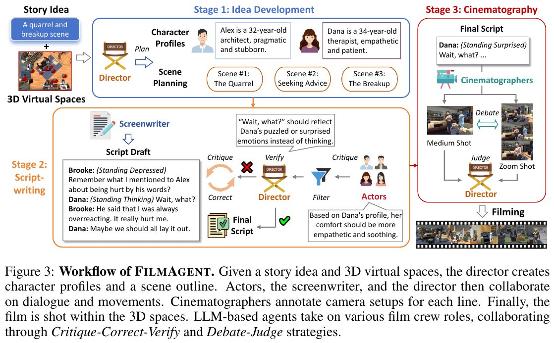 FILMAGENTの特徴は、複数のエージェントが分担して共同で作業を行い、それぞれの結果をフィードバックを通じて改善する点にあります。本システムには、脚本家エージェント、俳優エージェント、撮影監督エージェント、および監督エージェントが含まれており、各役割に応じて映画制作の各工程を担当します。特に、以下の3つのステージに分かれた作業プロセスが採用されています。