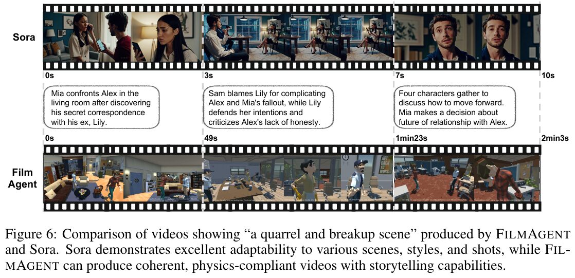 この図は、FILMAGENTとSoraという2つの異なる動画生成システムを使って、「口論と別れのシーン」を描いた動画を比較しています。Soraは様々な場面やスタイルに適応する能力に優れており、異なるショットを使用しています。しかし、FILMAGENTは一貫性があり、物理的法則に従った動画を生成することで、物語性の強いストーリーテリングを実現しています。この比較を通じて、両システムの強みと弱みが示されました。Soraは速いアイデア生成に役立ちますが、FILMAGENTは詳細なストーリーテリングで優位性を持っているとされています。