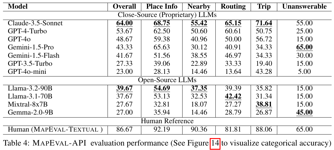 この図は、地理空間推論の能力を評価するための「MAPEVAL」を使った言語モデルの性能を示しています。表には、モデルの種類に応じた全体的な正確さやカテゴリーごとの正確さが示されています。クローズドソースのモデルがオープンソースモデルよりも全体的に優れていることがわかります。特に「場所情報」や「近く」のカテゴリーでの成績が良い一方、「旅行」や「答えられない質問」には課題が残っています。また、図では人間のパフォーマンスが全体的にモデルより優れていることが示されており、AIモデルの改善が必要とされています。