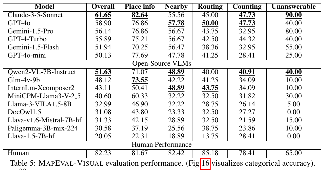 この表は論文におけるMAPEVAL-VISUAL評価の結果を示しています。表には、各モデルの地理的推論能力を評価するために「Overall/Place info/Nearby/Routing/Counting/Unanswerable」の6つのカテゴリでのスコアが記載されています。最も高いスコアは「Claude-3-5-Sonnet」の「Overall」で、61.65%です。「Human Performance」ではすべてのカテゴリで人間の方が良い成績を収めており、AIモデルと人間の性能差が明確です。この結果から地図情報の理解においてAIがまだ改善の余地があることがわかります。