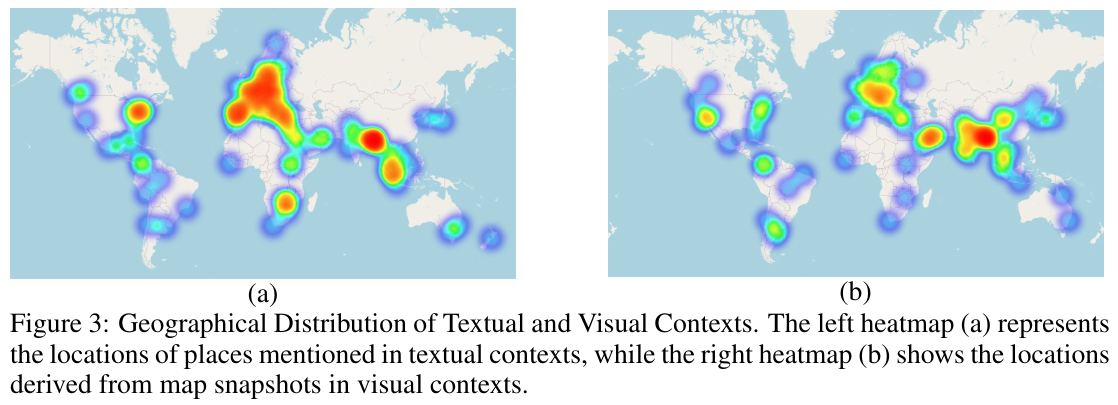 この図は、文章と視覚的なコンテキストの地理的分布を示しています。左側のヒートマップ (a) は、文章コンテキストで言及された場所の位置を示し、右側のヒートマップ (b) は、視覚的なコンテキストにおける地図のスナップショットから得られた場所を示しています。これにより、どの地域がよく言及され分析されているかが視覚的にわかります。これらは、地理的概念を理解し処理するためのモデルの能力を評価する目的で使用されます。