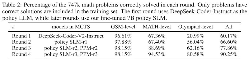 この画像は、論文における4つのラウンドを通じて、747kの数学問題を正確に解決した割合を表しています。初回はDeepSeek-Coder-Instructを使用し、その後のラウンドではファインチューニングされた7BポリシーSLMを使っています。表によると、GSMレベルの問題は最初のラウンドから高い解決率を保っており、MATHレベルはラウンドが進むごとに改善されています。特にオリンピアードレベルの問題は、Round 4で大幅な向上が見られます。総じて、ラウンドを進めるごとに全体の解決率が向上していることが示されています。この表は、モデルの自己進化プロセスが数学的推論能力を向上させていることを示しています。