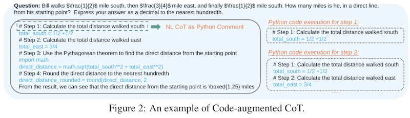 この画像は、計算問題を解く際に自然言語の説明とPythonコードを組み合わせた「コード強化された連鎖思考 (CoT)」の例を示しています。具体的には、問題をステップごとに分解し、Pythonでそれを計算する過程が示されています。 問題は、特定の距離を歩いた後の初点からの直線距離を求めるもので、ここでは単純な数学の計算がPythonコードで実施されます。各ステップはコメントとして記載され、コードの実行により結果が正確であることが確認されます。 この方法は、CoTの手法により視覚的にステップを追跡し、正確な解答を得るための手段として効果的であることを示唆しています。これは、コードと自然言語の統合が数学的推論の向上に寄与する方法の一例です。