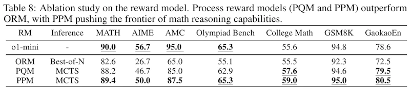 画像は、報酬モデルのアブレーション研究に関する表を示しています。PQRM(Process Quality Reward Model)とPPM(Process Preference Model)が、ORM(Outcome Reward Model)よりも数学的推論能力を向上させることを示しています。特にPPMは、数学的推論の最前線を押し進める手法です。表には、さまざまな数学の基準における性能が示されており、PPMを用いた場合に最も高い精度を達成していることがわかります。これは、MCTS(モンテカルロ木探索)を使用したインターフェースプロセスがより有効であることを示しています。つまり、ステップバイステップでの報酬評価がアウトカムベースのモデルよりも優れていることを示唆しています。