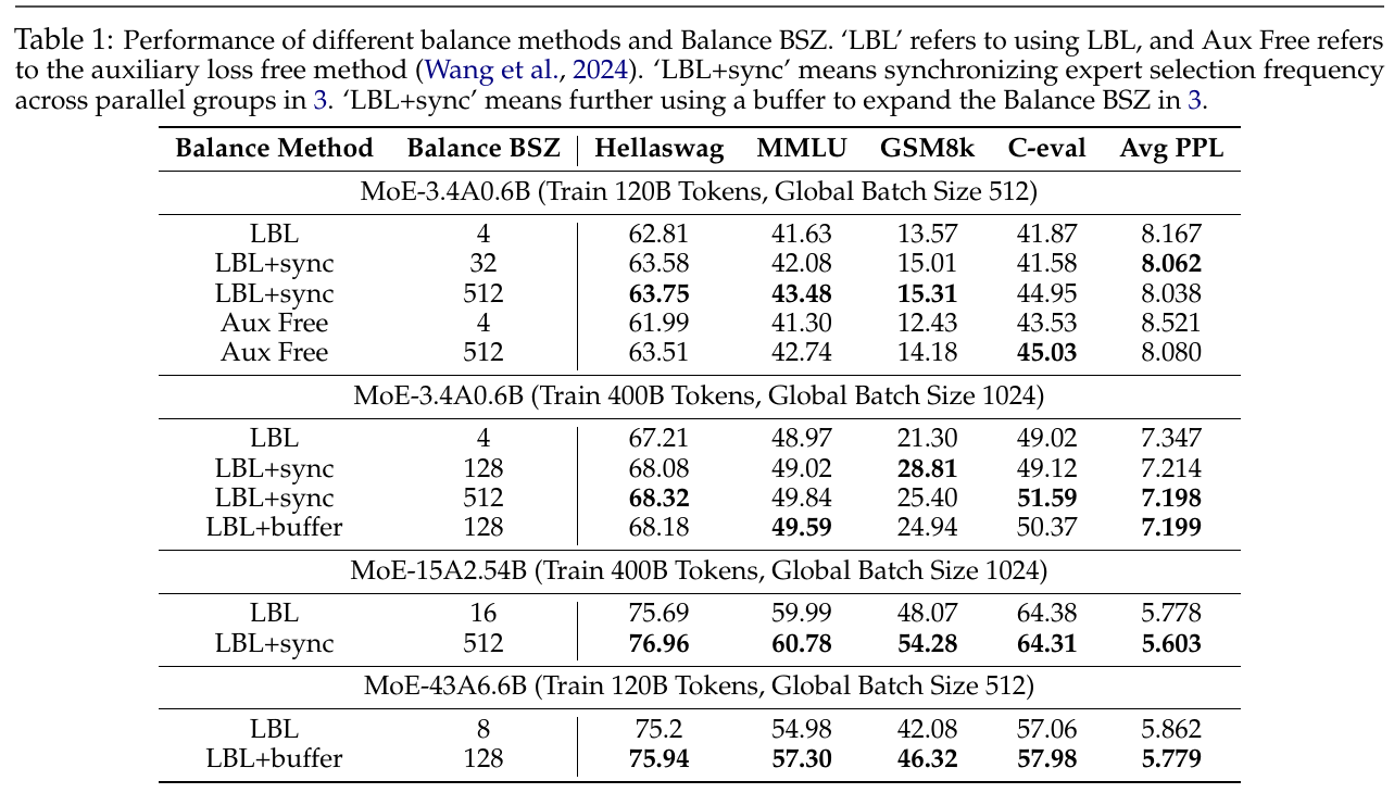 この図は、異なるバランス方法によるモデルの性能を示しています。MoEモデルを訓練する際の「負荷分散損失(LBL)」の使用方法がテーマです。表は様々なバランス方法を取り上げ、LLaMAなどのモデルでのパフォーマンスを、「Hellaswag」「MMLU」などのタスクで比較しています。 「LBL」は従来の方法で、「LBL+sync」はエキスパートの選択頻度を同期させる方法、「Aux Free」は補助損失を使わない方法です。結果から見ると、エキスパートの同期を行う「LBL+sync」は他の方法と比べてより良いパフォーマンスを発揮し、特に大きなバランスサイズ(Balance BSZ)でその効果が顕著です。 つまり、エキスパート間での同期がモデルの専門化や性能向上に貢献することが示されています。