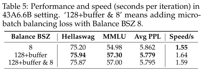 この表は、MoEモデルにおける「43A6.6B設定」において、異なるバランスBSZのパフォーマンスと速度を示しています。「128+buffer & 8」は、マイクロバッチバランシング損失を追加した設定を意味します。 表を見ると、バランスBSZを増やすとHellawagとMMLUのスコアが改善される一方で、平均PPL(予測を評価する指標)も減少します。速度は、グローバルバッチバランスを導入するとわずかに遅くなりますが、パフォーマンス的には向上します。具体的には、128+buffer設定はバランスBSZ 8の設定よりもわずかに遅いですが、全体の性能はより高く保たれています。このことは、モデルの専門化と性能向上において、グローバルバッチバランスが有効であることを示しています。