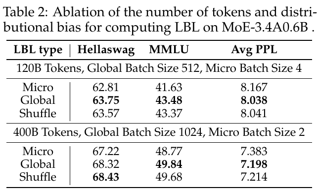 この表は、MoE-3.4A0.6BモデルでのLBL(負荷分散損失)を計算する際に、トークン数と分布バイアスの影響を検証した結果を示しています。具体的には、LBLの計算方法を微視的(Micro)、全体的(Global)、およびシャッフル(Shuffle)の3つに分けて比較しています。 上段は120Bトークン、下段は400Bトークンでモデルをトレーニングした場合です。全体的に、グローバルLBLで計算した場合のほうが、モデルの平均パープレキシティ(Avg PPL)が低く、性能が向上していることがわかります。この結果は、グローバルバッチでのLBL計算が専門性を向上させることを示唆しており、より多様なトークンを活用することで、専門家(エキスパート)の効果的な利用が可能となることを示しています。