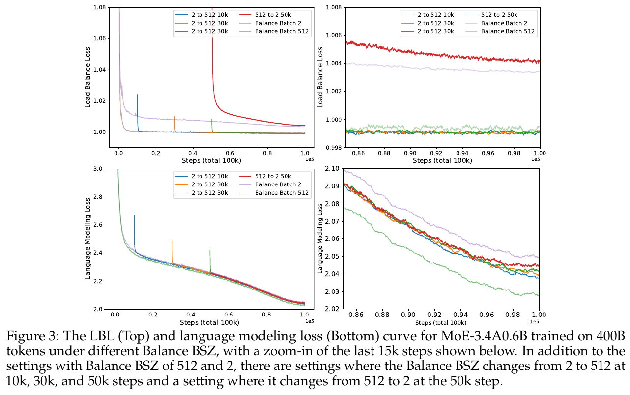 この図は、Mixture-of-Experts (MoE) モデルの学習におけるロードバランスロス (LBL) と言語モデリングロスの変化を示しています。左の上部と下部の図は、4000億トークンを使って学習した際のステップ数ごとのロスの減少を表しており、異なるバランス設定での挙動を示しています。右側のズームインした部分では、最終15,000ステップでの詳細な変化が示されています。「2から512」や「512から2」といった設定は、バランスを調整するタイミングを示しており、これにより単語やトークンがどのように専門化されるかが大きく影響されることがわかります。グローバルバッチでのバランス調整がより良い結果をもたらすことが示されています。