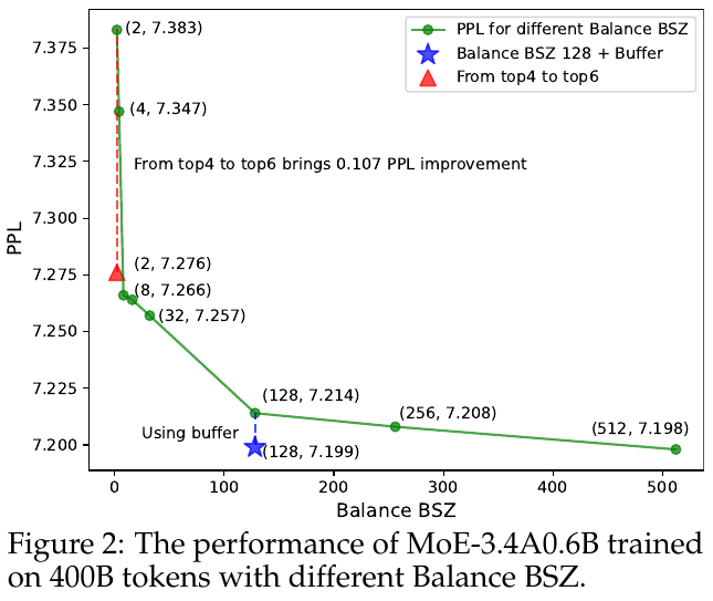 図2は、異なるバランスBSZ(バッチサイズ)でMoE-3.4A0.6Bモデルを400Bトークン上で訓練した際の性能を示しています。縦軸がPPL(Perplexity)、横軸がバランスBSZを表しています。PPLは言語モデルの性能を評価する指標で、値が低いほど良い性能を示します。図では、バランスBSZが増加するにつれてPPLが減少していることがわかります。これは、より大きなバランスBSZがより効果的な専門家選択(ドメイン特化)を促進し、モデル性能を向上させることを示しています。また、バランスBSZ128を使用してバッファを加えることで、さらにPPLが改善されています。