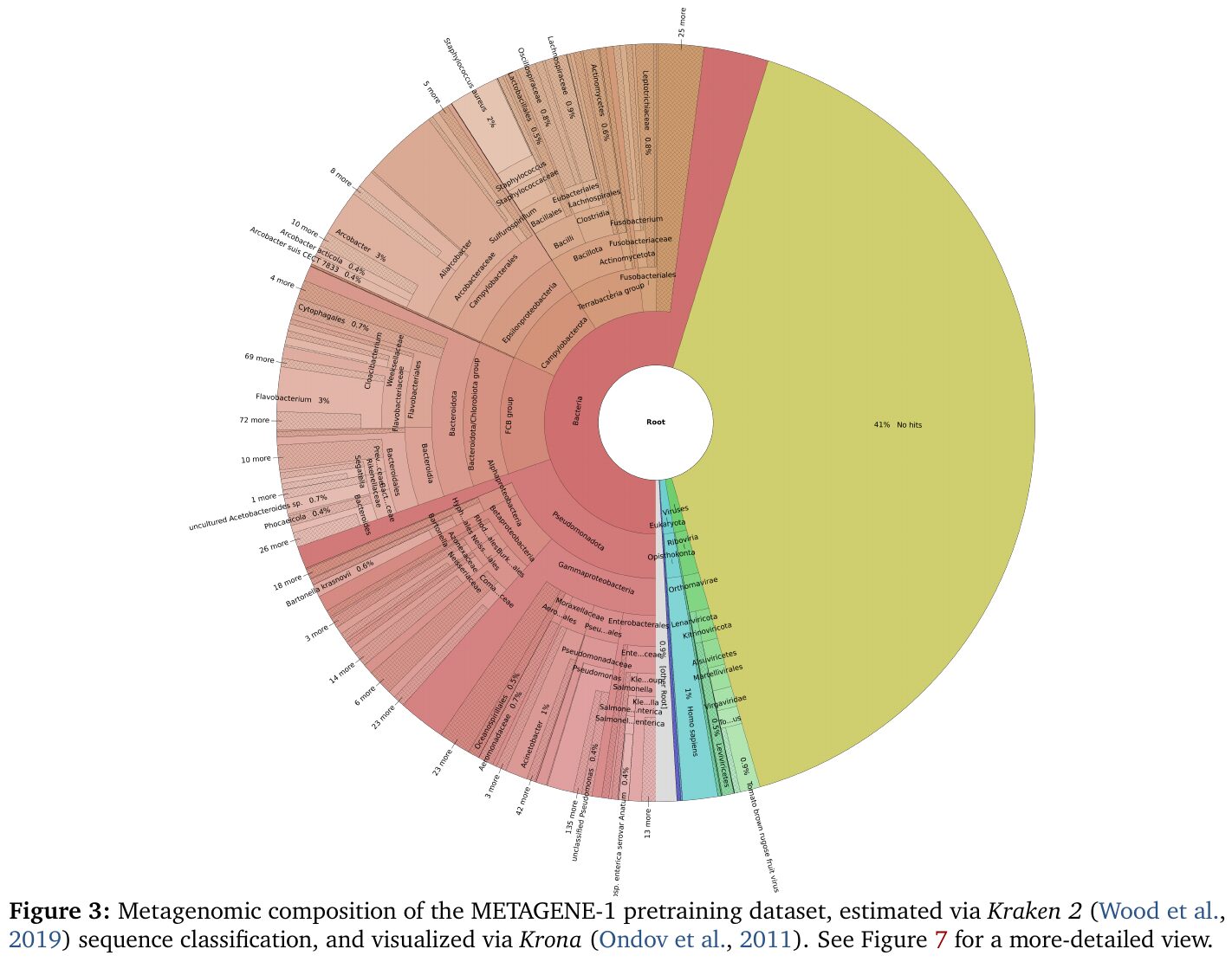 この図は、METAGENE-1の事前学習データセットのメタゲノム組成を示しています。Kraken 2というツールを使い分類された結果で、Kronaというソフトウェアで可視化されています。中心の「Root」から読んでいくと、全体の55%がバクテリアであることがわかります。続いて、ウイルスが2%、ヒトを主とする真核生物が2%を占め、残りの41%は未分類か未知の起源という構成です。これにより、公共衛生や病原体検出に役立つモデルを作成するための基盤データセットが非常に多様であることが示されています。このような可視化によって、データセット内の微生物の多様性やその割合が一目でわかります。