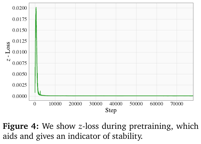 この図はMETAGENE-1の事前学習中におけるz損失を示しています。z損失は、ニューラルネットワークの安定性を示す重要な指標です。図を見ると、ステップ数の初期段階ではz損失が急激に減少し、その後ほぼ安定している様子が確認できます。これは、モデルが効率的に学習し、安定した状態に達したことを示しています。METAGENE-1は多様なメタゲノムデータセットに基づいて訓練されており、この安定した学習は、疫病監視や病原体検出のための効果的な基盤モデル構築を支えています。