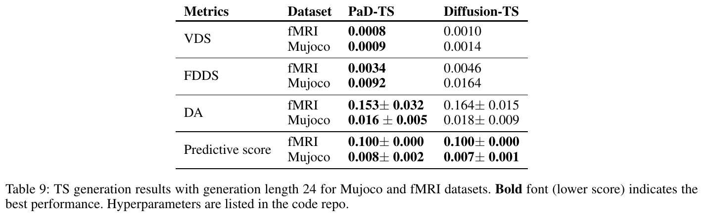 この画像は、PaD-TSとDiffusion-TSの2つのモデルを用いてMujocoとfMRIデータセット上で時系列データを生成した結果を示しています。VDS(Value Distribution Shift)とFDDS(Functional Dependency Distribution Shift)のスコアが小さいほど、生成されたデータが元のデータに近いことを示しています。特に、PaD-TSはほとんどの指標で優れた性能を示しており、特にfMRIデータセットでのVDSとDA(Discriminative Accuracy)のスコアでDiffusion-TSを上回っています。これにより、PaD-TSが時系列データの生成において優れた正確性と元のデータ特性の保持能力を持つことがわかります。