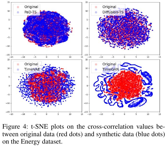 図4は、エネルギーデータセットにおけるオリジナルデータ(赤い点)と合成データ(青い点)のクロスコリレーション値を示すt-SNEプロットです。4つのプロットは異なるモデルの出力を比較しています。PaD-TSモデルは、オリジナルデータと合成データのクロスコリレーションの分布を他のモデルよりも良く保持していることが示されています。この図は、合成データが元のデータの統計的特性をどれほど再現できているかを視覚的に評価するために利用されています。