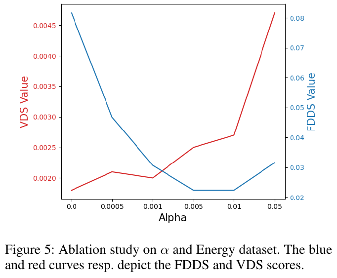Figure 5は、エネルギーデータセットにおけるαのアブレーションスタディを示しています。青色と赤色の曲線がそれぞれFDDS(関数依存性の分布シフト)とVDS(値の分布シフト)スコアを表しています。αが増加すると、VDSスコアが上昇し(パフォーマンスが低下)、FDDSスコアが低下(パフォーマンスが向上)する傾向があります。ただし、αが大きくなりすぎると(例:0.05)、トレーニングが崩れる危険性があります。