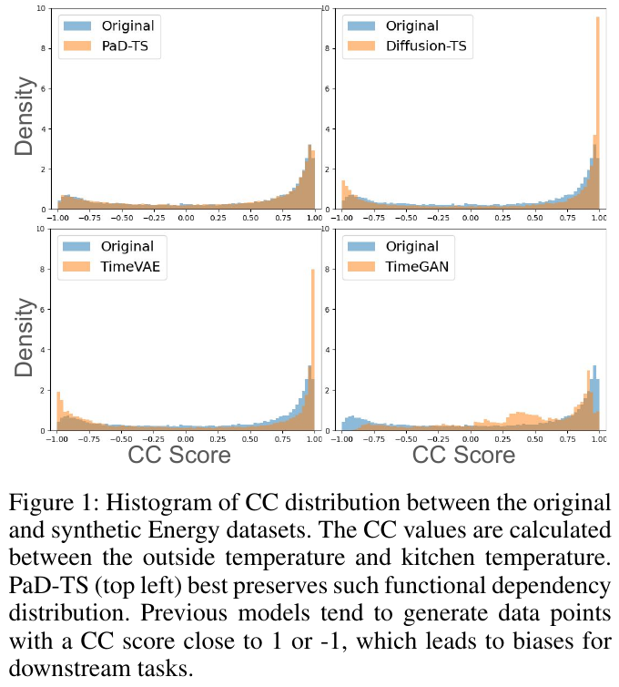 図1は、元のデータセットと合成データセット間の交差相関(CC)スコア分布を示しています。これらのCC値は外気温とキッチンの温度間の依存関係を表し、PaD-TSモデル(左上)がこの依存関係の分布を最もよく保存しています。従来のモデルはCCスコアが1または-1に近いデータを生成しがちで、これにより後続のタスクにバイアスが生じることがあります。