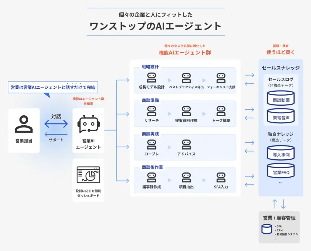 このAIエージェントは、企業のホームページや決算情報などの公開データに加え、商談履歴や成約データといった社内情報を整理し、営業担当者へ提供。これにより、新人営業担当者は組織全体の知見を活用できるように。重ねて、熟練の営業担当者にとっては情報収集の手間が減り、顧客との商談により多くの時間を割くことが可能。