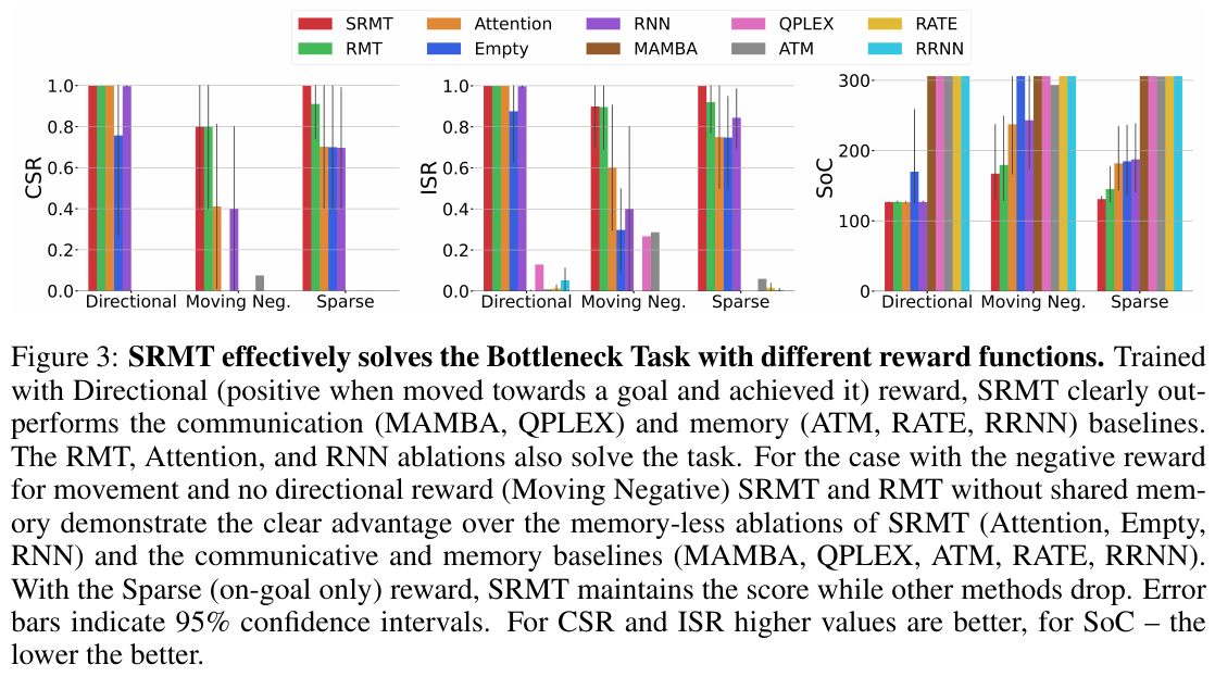 図3はSRMT(Shared Recurrent Memory Transformer)が異なる報酬関数を用いてBottleneck Taskをどのように解決するかを示しています。CSR(Cooperative Success Rate)やISR(Individual Success Rate)では高い値が良く、SoC(Sum of Costs)では低い値が良いとされます。 この図では、SRMTがDirection(目標へ向かうと得られる報酬)で効果的に学習し、他の手法(MAMBA, QPLEXなど)よりも高いパフォーマンスを示しています。各柱の色は異なる手法を表し、エラーバーは95%信頼区間を示しています。 「Moving Negative」や「Sparse」といった難しい報酬設定においても、SRMTは高い性能を発揮し、メモリ共有が効果的に機能していることが確認できます。この結果として、SRMTは他のベースラインに比べて優れた協調性を持っていると結論づけられています。