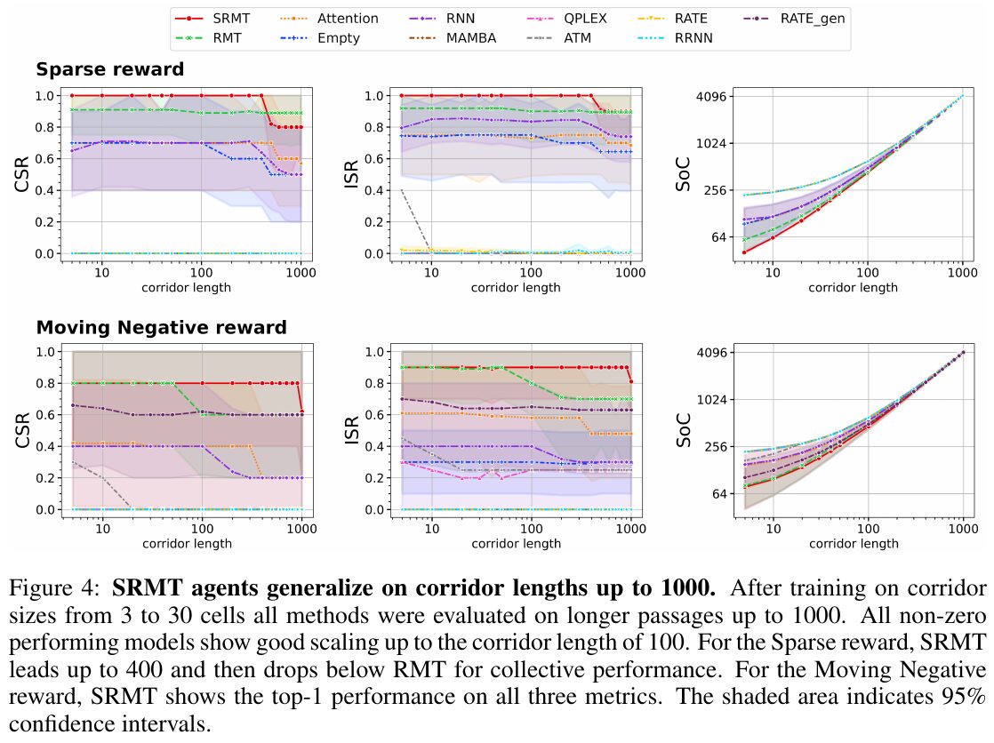 図4は、SRMTという手法が最大1000の長さの回廊に対して一般化できることを示しています。SRMTは、3から30のセルサイズの回廊で訓練された後、1000までの長い回廊で評価されました。Sparse報酬では、SRMTが400までの回廊長で良好なパフォーマンスを示し、RMTに次ぐ結果となっています。Moving Negative報酬では、SRMTがすべてのメトリクスで最も高いパフォーマンスを示しています。図中のグラフは、協力的成功率(CSR)、個別成功率(ISR)、コスト合計(SoC)を回廊の長さに対する指標として示しており、SRMTがさまざまなタスクで競争力を持つことを示しています。シェーディングされた領域は95%の信頼区間を示します。