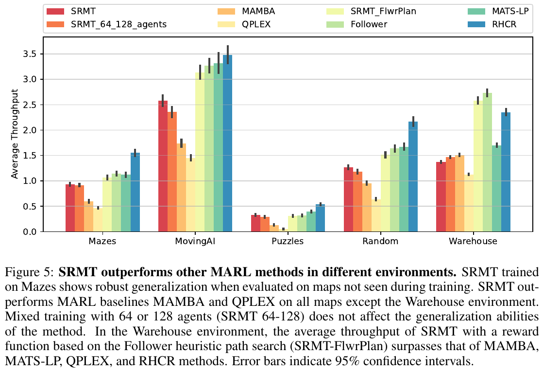 図5は、異なる環境においてSRMTが他のMARL手法を上回ることを示しています。具体的には、MazesでのSRMTのトレーニングは、他の未見のマップでも高い汎化性能を発揮しています。SRMTは、Warehouse環境を除くすべてのマップでMAMBAやQPLEXなどのMARLのベースラインよりも良い性能を示しています。また、64または128エージェントでの混合トレーニング(SRMT 64-128)は、手法の汎化能力に影響を与えません。特にWarehouse環境では、Followerのヒューリスティックなパス検索を基にした報酬機能を持つSRMT(SRMT-FlwrPlan)が、他の手法よりも高い平均スループットを示しています。誤差バーは95%の信頼区間を示しています。