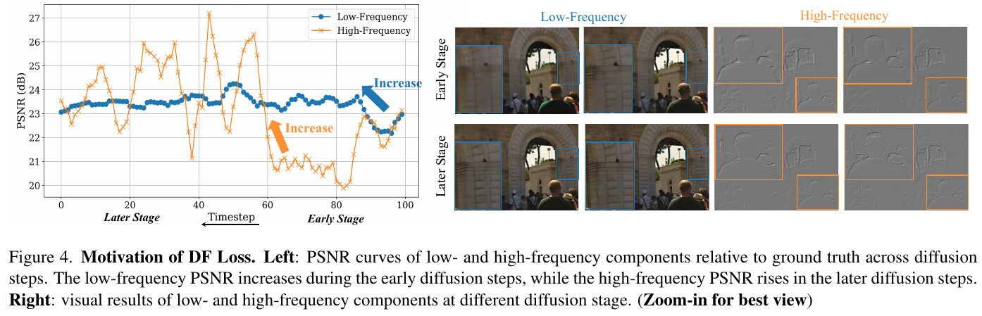 この図は、STARという手法がどのようにしてリアルなビデオ超解像を実現するかを示しています。左のグラフでは、PSNRという画像の鮮明さを示す指標が時間の経過を追って変化する様子を示しています。低周波成分は初期の段階で向上し、高周波成分は後半で向上します。右側の画像は、低周波と高周波成分が異なる拡散段階でどのように視覚的に表れるかを示しています。この図は、STARにおけるDF Loss(動的周波数ロス)の導入が、異なる周波数成分に対してうまく働くことを視覚的に説明しています。