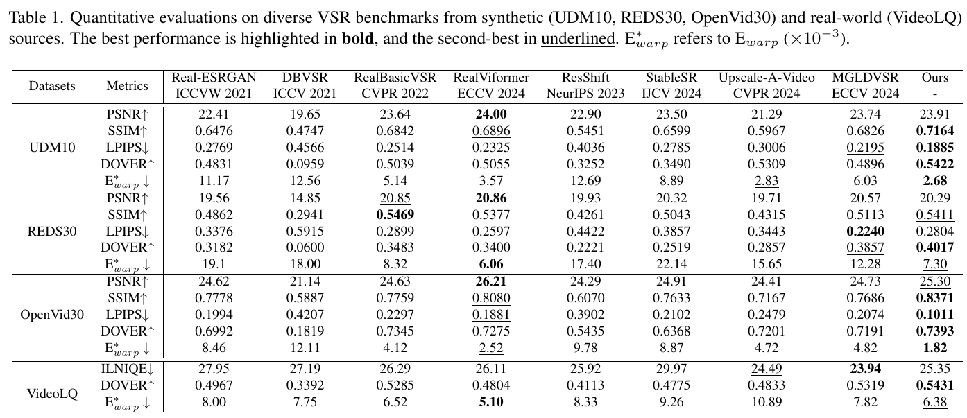 この表は、さまざまなビデオ超解像(VSR)モデルの評価結果を示しています。評価は合成データセット(UDM10、REDS30、OpenVid30)および実世界のデータセット(VideoLQ)に対して行われました。表には、PSNR(高いほど良い)、SSIM(高いほど良い)、LPIPS(低いほど良い)、DOVER(高いほど良い)、E_warp*(低いほど良い)の各指標が示されています。「Ours」と表記された列は、提案されたモデルSTARのパフォーマンスを表しており、ほとんどの指標で他のモデルを上回っています。特に、STARは高いPSNRとSSIMを達成し、LPIPSやE_warp*も低く抑えています。これは、STARが空間的な細部と時間的な一貫性の両方において優れた能力を持つことを示しています。