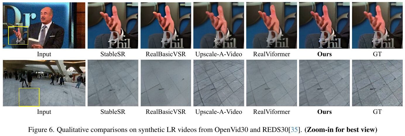 この画像は、低解像度の動画を高解像度に変換する技術の効果を比較したものです。画像上部の例では、人の顔や手の細部とテキスト「Dr. Phil」の再現状況が示されています。下部の例は、地面の模様の精度を比較しています。各列は異なる技術の出力を示しており、「Ours」と表記された列は、本研究「STAR」の結果を示しています。結果として、STARは他の方法と比較して、より自然で詳細な再現を実現し、元の高解像度画像に近い結果を提供しています。このことから、STARがリアルな空間的ディテールと強固な時間的一貫性を達成していることがわかります。