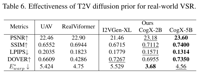 この表は、T2V(テキストからビデオ)拡散モデルを用いたビデオ超解像技術の効果を比較したものです。表に示されているのは、異なるモデルとその性能を評価するための指標で、各指標は映像の品質や一致度を示しています。 具体的には、PSNR(ピーク信号対雑音比)は数値が高いほど良く、画像品質の高さを示します。SSIM(構造類似度)も同様に値が高いほど画像の構造がよく保存されていることを示します。LPIPS(知覚画像パッチ類似度)は逆に、値が小さいほど良く、画像の見た目の違いが少ないことを示しています。DOVERは映像の鮮明さを示し、値が高いほど良いです。E*warpは動きのズレを示し、値が小さいほど時間的な一貫性が高いことを示しています。 この表から、CogX-5Bが他のモデルと比較してほとんどの指標で優れた性能を持っていることがわかります。これは、リアルな映像品質と時間的な一貫性を提供するための強力な拡散モデルが貢献していることを示唆しています。