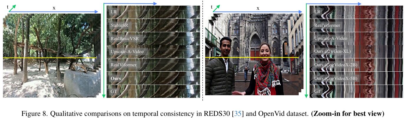 この図は、論文「STAR: 空間-時間の強化による現実世界のビデオ超解像」において、REDS30とOpenVidデータセットでの時間的一貫性の質的比較を示しています。左側の画像は、ビデオフレームの時間差を示し、様々な手法が時間的一貫性をどのように処理しているかを視覚的に比較しています。右側の画像も同様に、異なる方法で処理されたビデオフレームの時間軸と空間軸での変化を示しています。 STARは、他の手法と比較して、より自然な空間的詳細と強固な時間的一貫性を実現しています。この図は、時間的一貫性を重視して詳細な比較が行われており、特にSTARの手法が複雑な動画シチュエーションで優れた結果を示すことを可視化しています。動画の品質評価をするために、さまざまな手法の比較が行われています。