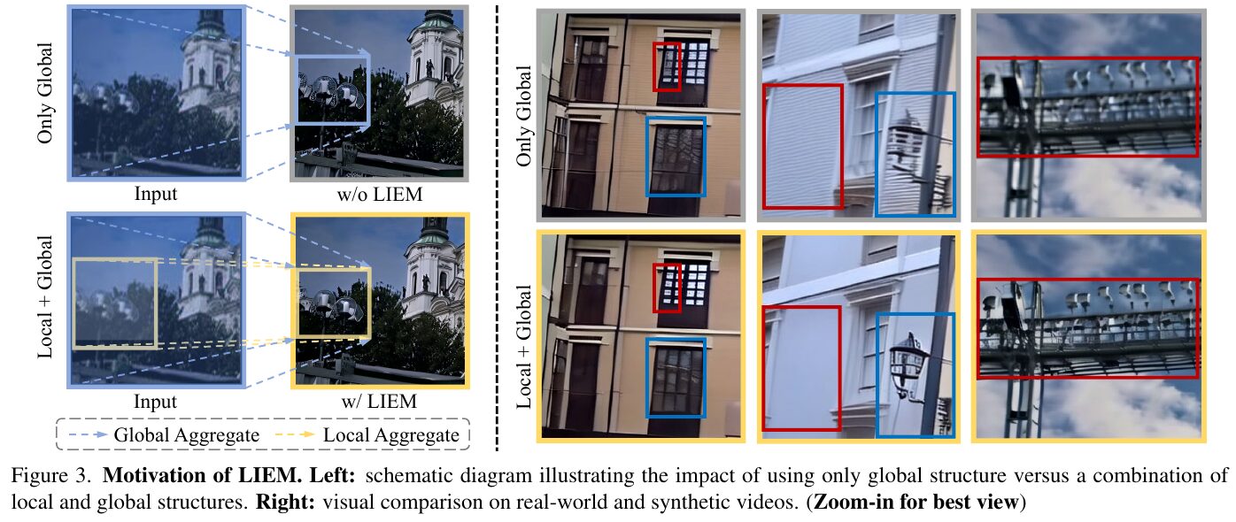 この図は、提案されたLIEM(Local Information Enhancement Module)の効果を示しています。左側では、全体の構造だけを使うのと、局所的な情報を加えて使う場合の違いが示されています。右側では、実際の動画と合成動画での視覚的な比較がされています。上段は、LIEMを使用せずに世界とだけ情報を組み合わせた場合です。下段は、LIEMを使用し、局所的な詳細も考慮した場合です。LIEMを使用することで、細かい部分の復元がより鮮明になり、アーティファクトが軽減されていることが視覚的に確認できます。これは、より高品質な動画超解像を実現するためのポイントです。