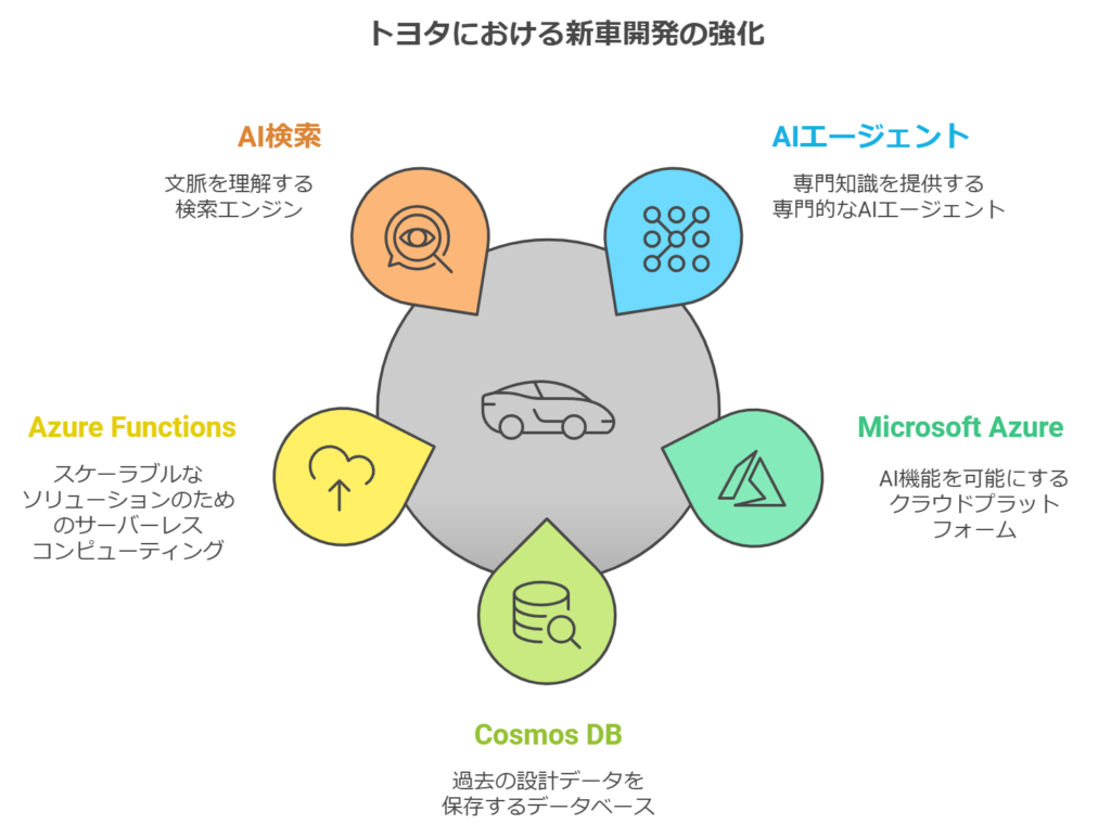 例えば、「より速く走る車を作るにはどうすればよいか」という質問に対し、エンジンエージェントは出力向上の観点から、規制エージェントは排出ガス規制の観点から回答を提供し、システムがこれらを統合します。特に、パワートレーン開発部門での活用が進んでおり、エンジンやバッテリー、走行性能など多岐にわたる専門知識の継承が期待されています。