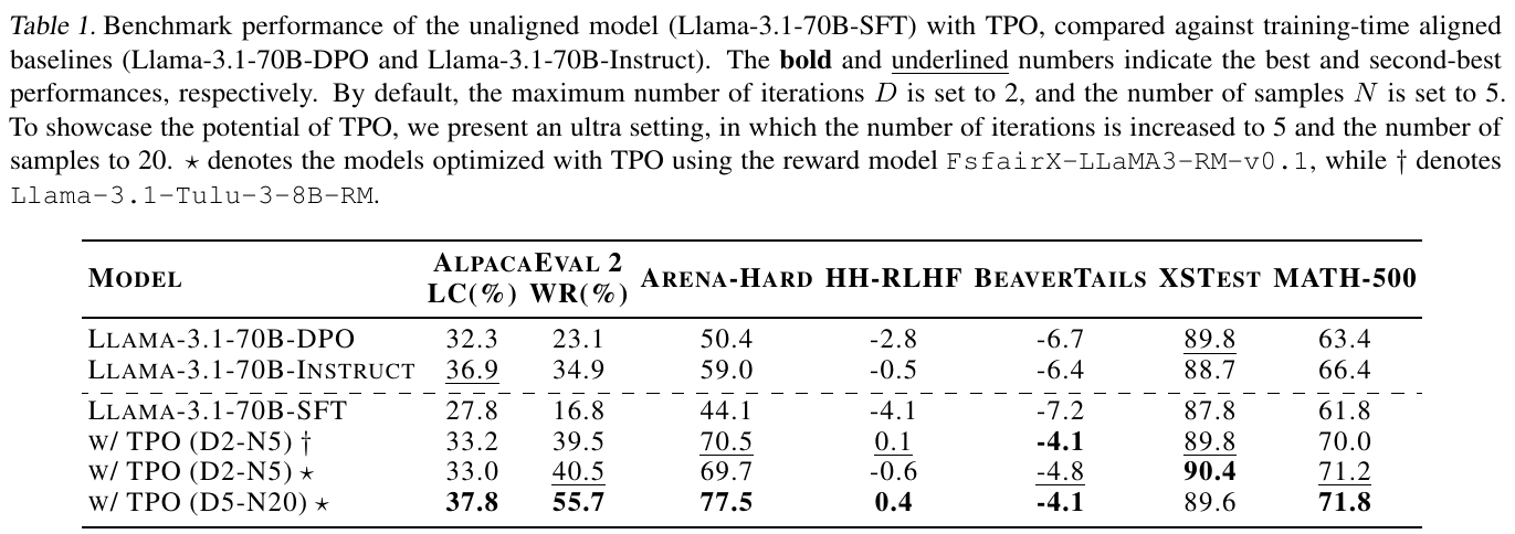 このテーブルは、TPO(テスト時の嗜好最適化)を用いたモデルのベンチマーク性能を示しています。ここでは、未調整のモデル(Llama-3.1-70B-SFT)が異なる基準を持つモデルと比較されています。基本的なテストでは、DPOやInstructモデルよりも性能が低かったLlama-3.1-70B-SFTが、TPOを適用することで各ベンチマークで劇的に性能を向上させることが示されています。特に「D5-N20」の設定では、ほとんどの測定基準で他のモデルを上回る結果を出しています。これにより、TPOを数回適用するだけで、トレーニング時の調整を超える性能が得られる可能性が示されました。